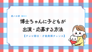 番組別ガイド 博士ちゃんに子どもが出演・応募する方法【テレビ朝日・才能発揮チャンス】 うちの子、〇〇だけは異常にくわしい!そんなお子さんにぴったりのテレビ朝日「博士ちゃん」への出演応募方法を解説します。常時募集・公式HPから誰でも応募可能です。 2026.03.29 番組別ガイド